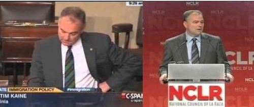Kaine as Virginia governor repeatedly refused to permit state police to help federal immigration authorities collar illegal alien thieves, rapists and murderers [Tim Kaine and illegal-alien crime, Washington Times Editorial, January 20, 2007]. His claim: immigration control was a “federal matter” [Panel Wants Troopers On Immigration Enforcement, by Kristen Mack, Washington Post, November 14, 2007]. Maybe that’s why he wants to jettison our immigration laws, as he announced after Clinton picked him to do the ironing.
