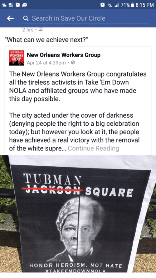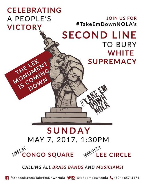 The Facebook page for Take ‘Em Down Nola is calling for a march to Lee Circle on Sunday afternoon complete with a brass band. The event claims, “The monument is coming down” although there is no indication whether or not that will specifically happen on Sunday.