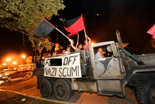 Since then a small but vigilant contingent of monument supporters from around the country have been guarding the Jefferson Davis statue day and night, presumably because it would be the easiest to remove. The primary impediment to moving the Davis monument is simply that it is bolted in place while the Robert E Lee statue is up high on a pedestal surrounded by street car lines and the P.G.T. Beauregard monument is extremely heavy.Monday evening, as about a dozen monument supporters were on guard, an assault vehicle (which some have identified as a deuce and a half) full of so-called Antifa, or anti-fascist demonstrators showed up looking for a fight. A banner on the side of their vehicle read, “F— off Nazi scum!” and they were waving the red and black flags of anarcho-communism.