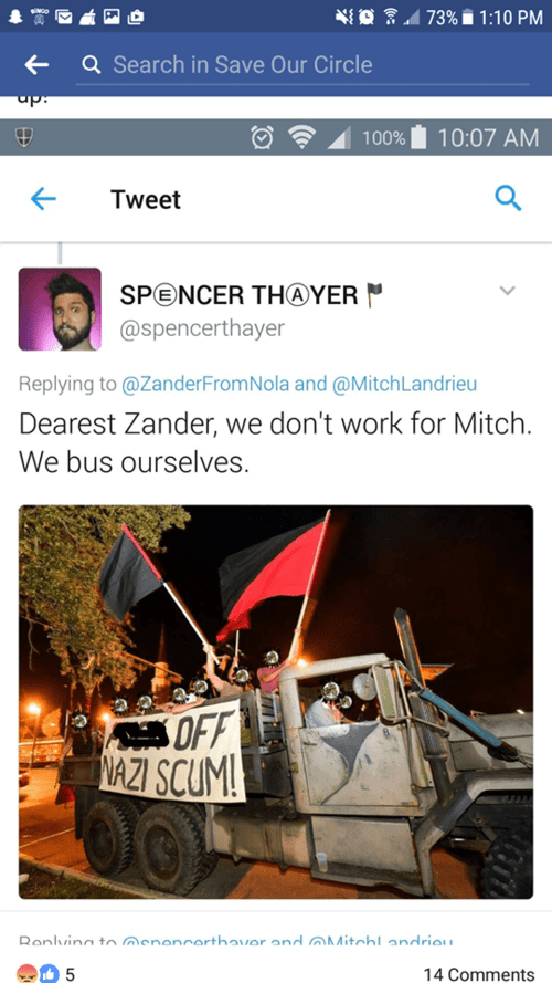 Several Communist groups have already taken credit for the melee including the local New Orleans Workers Group and Take ‘Em Down Nola (which share founding members) as well as a Chicago group called Chicago Rising (aka Occupy Chicago). One leader of Chicago Rising, Spencer Thayer, responded to accusations that his group was bussed in by Mayor Mitch Landrieu, “We don’t work for Mitch. We bussed ourselves.”