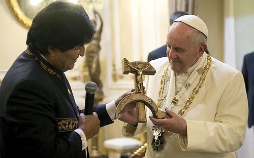 The Pope apparently regards capitalism as a great evil, rather than a generator of wealth. Thus in July he visited Bolivia to attend the World Meeting of Popular Movements. Presidente Evo Morales gave the Pope a Hammer-And-Sickle crucifix, perhaps as a little leftward nudge to the “Pope of the poor.”