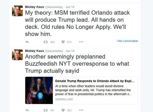 Contrary to the Post's headline suggesting that Trump had posited some crazy theory about Obama secretly meeting with Omar Mateen to plot the attack—No, this gun is much better for a mass shooting, Omar—Trump criticized the Obama administration policies that are not keeping us safe. (It's completely unprecedented to respond to a mass murder by criticizing the policies that allowed it to happen!)