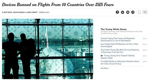 The New York Times, March 22, 2017: Devices Banned on Some Planes Over ISIS Fears "Intelligence showing that the Islamic State is developing a bomb hidden in portable electronics spurred the United States and Britain on Tuesday to bar passengers from airports in a total of 10 Muslim-majority countries from carrying laptop computers ... two senior American counterterrorism officials said. ..."