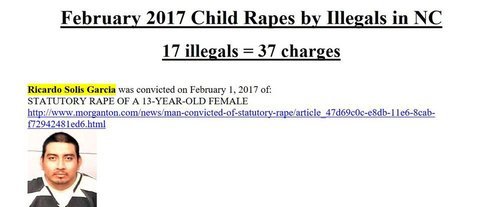 The list, for a single month in a single state, goes on in the same vein through 87 separate offenders. When not providing North Carolina meatpackers with cheap labor, immigrant workers seem to spend all their time raping little girls.