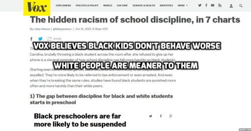 As the Huffington Post put it: "American Schools Are STILL Racist, Government Report Finds." The evidence? "Five percent of white students were suspended annually, compared with 16 percent of black students, according to the report." Q.E.D.