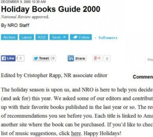 The last NR competition ran in 1997, at which time William F. Buckley for his own discreditable reasons had already fired O’Sullivan, but had not yet leaked the disinformation that O’Sullivan was “resigning to write a book.” The War Against Christmas Competition was promptly dropped, along with the cause of patriotic immigration reform—not coincidentally. In 2000, NR itself actually published a “Holiday Books Guide”.