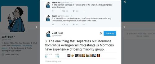 Being highly politically engaged means that Mormons generally are also easily influenced by “conservative intellectuals” i.e. Conservatism Inc. talking heads. In a recent presidential poll, 14% of Utahans volunteered that on the day of the election they would be writing in the name of Mitt Romney [ The Rachel Maddow Show, Transcript, August 8, 2016]