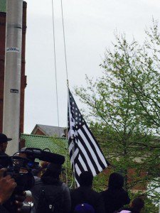 Perhaps the most symbolic moment occurred when rioters took down the American flag, and replaced it with a black and white version at City Hal. [Unrest in Baltimore as thousands protest Freddie Gray’s death, Russia Today, April 26, 2015]. The black rioters showed the