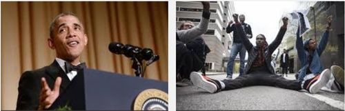 Charles Dickens couldn’t have scripted it better, as riots swept through Baltimore even as Barack Obama and his media pals partied together at the White House Correspondents’ Dinner. While Obama and his celebrity hangers-on cracked jokes about Fox News scaring “old white people,” younger white people were being attacked in the streets by infuriated blacks ostensibly protesting the recent death of Freddie Gray, a black man who fled police, was detained, and died under circumstances that are still under investigation [The 45-minute mystery of Freddie Gray’s death, by Kevin Rector, The Baltimore Sun, April 26, 2015].