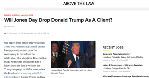 Donald Trump has retained Jones Day to handle his election law practice and also held meetings with Senators and Congressmen in Jones Day’s Washington office. So David Lat [Email him], founder of the legal tabloid Above the Law, decided to create a stink about how having "Donald Drumpf" as a paid client conflicts with the firm’s “extensive pro bono work on behalf of immigrants’ rights,” and he found anonymous Leftist associates at the firm to complain about it.