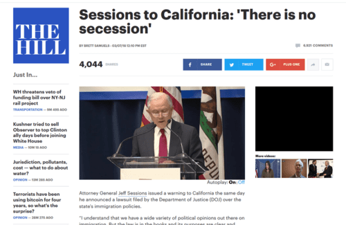 Attorney General Jeff Sessions is finally taking action against the state of California by filing suit against California’s nullification of federal immigration laws. The rhetoric coming from California’s officials is extreme, with Governor Jerry Brown saying the action constitutes a state of “war”. [Jerry Brown: Trump ‘Going To War Against The State of California,’ by Joel Pollak, Breitbart, March 7, 2018] This does little to change the impression California is already operating as a post-American state, conquered by a foreign people, with actual Americans fleeing as de facto refugees. Yet it also shows the shifting goalposts of the immigration debate, as leftists are now arguing states have the right to determine their own immigration policy, when they were arguing the opposite just a few years ago in regards to Arizona’s SB 1070.