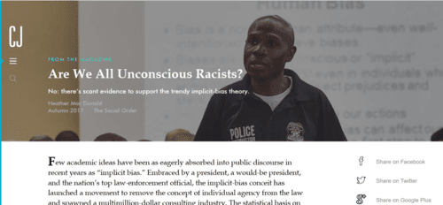 Few academic ideas have been as eagerly absorbed into public discourse in recent years as “implicit bias.” Embraced by a president, a would-be president, and the nation’s top law-enforcement official, the implicit-bias conceit has launched a movement to remove the concept of individual agency from the law and spawned a multimillion-dollar consulting industry. The statistical basis on which it rests is now crumbling, but don’t expect its influence to wane anytime soon.Ms. Mac Donald herself suggests that it is “taboo in universities and mainstream society to acknowledge intergroup differences in interests, abilities, cultural values, or family structure that might produce socioeconomic disparities.”Implicit bias purports to answer the question: Why do racial disparities persist in household income, job status, and incarceration rates, when explicit racism has, by all measures, greatly diminished over the last half-century? The reason, according to implicit-bias researchers, lies deep in our brains, outside the reach of conscious thought. We may consciously embrace racial equality, but almost all of us harbor unconscious biases favoring whites over blacks, the proponents claim. And those unconscious biases, which the implicit-bias project purports to measure scientifically, drive the discriminatory behavior that, in turn, results in racial inequality.