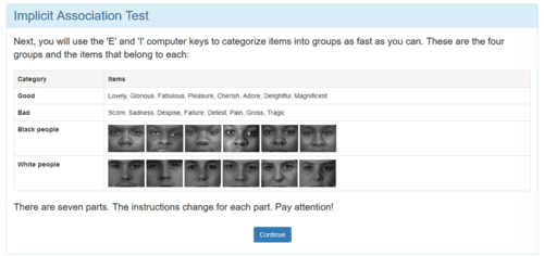 The race IAT (there are non-race varieties) displays a series of black faces and white faces on a computer; the test subject must sort them quickly by race into two categories, represented by the “i” and “e” keys on the keyboard. Next, the subject sorts “good” or “positive” words like “pleasant,” and “bad” or “negative” words like “death,” into good and bad categories, represented by those same two computer keys. The sorting tasks are then intermingled: faces and words appear at random on the screen, and the test-taker has to sort them with the “i” and “e” keys. Next, the sorting protocol is reversed. If, before, a black face was to be sorted using the same key as the key for a “bad” word, now a black face is sorted with the same key as a “good” word and a white face sorted with the reverse key. If a subject takes longer sorting black faces using the computer key associated with a “good” word than he does sorting white faces using the computer key associated with a “good” word, the IAT deems the subject a bearer of implicit bias. The IAT ranks the subject’s degree of implicit bias based on the differences in milliseconds …In other words, the test is obvious nonsense. This is what the test looks like—a screenshot from my computer: