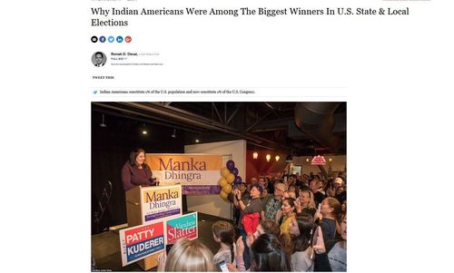 At a time when so many of our values are under attack, Indian Americans are stepping up to run, win, and lead. Last Tuesday, 25 of them won their elections in New Jersey, North Carolina, Tennessee, and Washington State. We already know of 50 candidates on the ballot next November—so it is critical that we lay the groundwork now to elect the most viable candidates who reflect our community’s values. Our community is on the rise. [Why Indian Americans Were Among The Biggest Winners in U.S. State & Local Election, by Ronak Desai, Forbes, November 19, 2017]