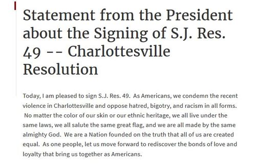 But let the record show that President Trump himself defied this Resolution in some small way. He signed the resolution on September 14, but attached a “signing statement.” A “signing statement” is a tool that Presidents have increasingly used to place an interpretation on legislation that might influence its implementation. Thus Trump’s statement said that Americans “oppose hatred, bigotry, and racism in all its forms,” but did not condemn a specific group, obstinately sticking with his contention that there is blame on both sides. [Faced with an up-or-down choice on Charlottesville resolution, Trump chooses third option, by Gregory Korte, USA Today, September 15, 2017]