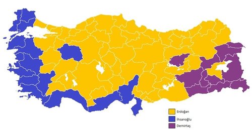 Map 1: The 2014 election—İhsanoğlu, the Kemalist wins the blue metro regions, Erdoğan wins the yellow rural regions, and Kurdish candidate wins the purple Kurdish regions: