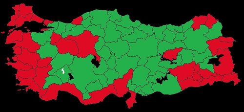 Map 3: The referendum results. Steyn writes "The Kurdish south-east, the old secular Rumelian west - and in between the vast green carpet of a new post-Kemalist caliphate:"