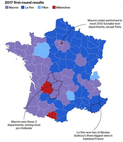 (2) In re the April 23rd election in France, a friend notes that if you color the map of France by the winner in each of the 96 mainland departments, Marine Le Pen's 46 are path-connected. That's math-speak for: Given any two points in a region, you can construct a path from one point to the other that never leaves the region. Emmanuel Macron's 41 departments are not path-connected.