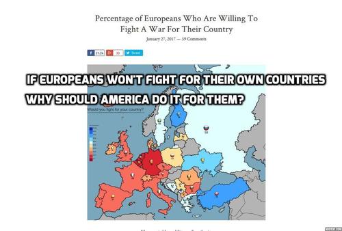 Ominously, a 2015 study showed minuscule numbers of Europeans are even willing to fight for their country, including only 18% (!) of Germans [Percentage of Europeans Who Are Willing To Fight A War For Their Country, Brilliant Maps, January 27, 2017].