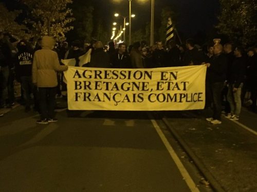 After they spoke, French and Breton patriots marched to the center where the migrants are housed, shouting slogans that reflected their opposition both to migrants and to the politicians who let them in: “Breton youth against the rabble,” “Not Paris, not Africa, this is Brittany,” “Breton youth against the Left,” and, in English, “Refugees not welcome.”