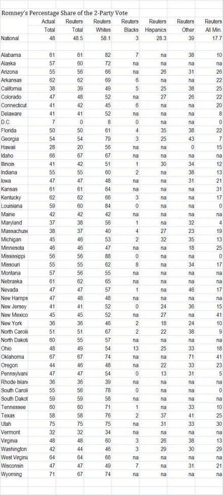 (After all the votes were counted, Obama’s victory margin turned out wider than almost all polls had predicted. The Reuters’ poll has Romney at 48.5 percent, so it was a half-point too high.)
