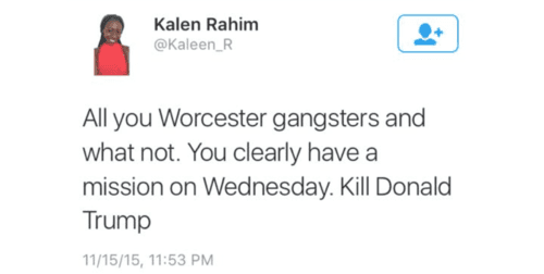 And, according to Turtleboy, one young black woman, Kaleen Rahim, did explicitly call for Trump’s murder: