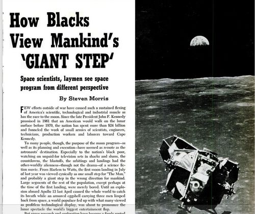 Black leaders were intensely critical. As man was about to land on the moon, the black magazine Jet was condemning the space program for using money which could be better spent on welfare programs for blacks. [Blacks Scarce as Men on Moon at Launch, by Simeon Booker, Jet, July 31, 1969]