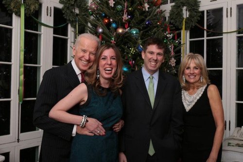 Reporter Amie Parnes tried to block off Biden's pincers as they crept too close for comfort from behind and climbed up her torso during a Christmas party photo.