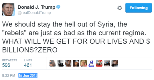 And listening to the President speaking there, he doesn't sound very Trumpish. On the news commentary websites, everybody and his brother have been posting Trump's tweets from four years ago, when it looked as though Barack Obama might do something or other in Syria. Sample One: