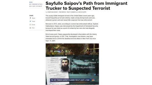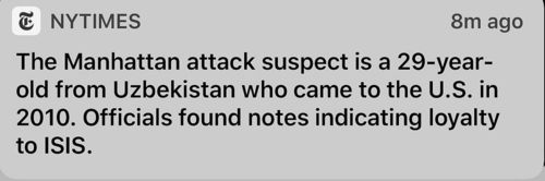 The Uzbeki, name of Sayfullo Saipov, 29 years old, married with either two or three young children, came to the U.S.A. in 2010 on a Diversity visa. He's worked as an Uber driver, perhaps having misread the word "Uber" in the job ad as "Uzbek."