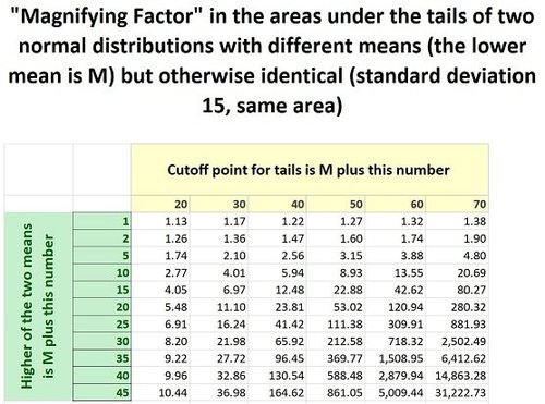 So if the the mean for population A is 90 (around the world average IQ) and the mean for population B is 15 points higher (the East Asian average), then out beyond a cutoff point IQ 90+50=140 (pretty darn smart) there are nearly 23 times as many Bs per million (or per any fixed number) as As.