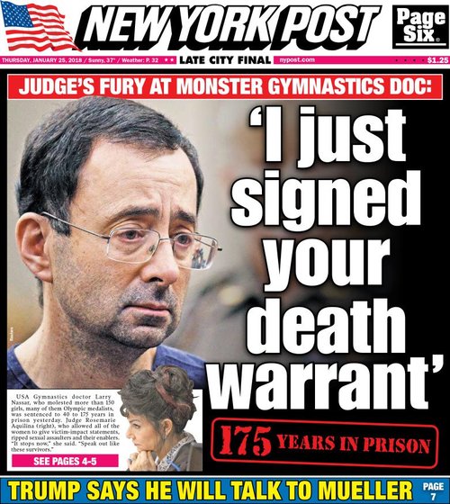 Once again for emphasis: Larry Nassar is a disgusting pervert, if we're still allowed to say "pervert," and I'd have sent him down for five to ten with a clear conscience. I just don't agree that what he did was as sensationally horrible as the court, and my New York Post, were making it out to be.