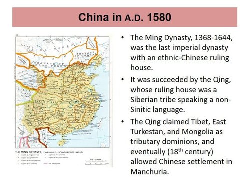 You can see that less than half the territory of the People’s Republic is Chinese in base ethnicity. One-quarter is Tibetan; one-sixth Turkic; one-tenth Mongolian. Metropolitan China, the part of the People’s Republic that is Han Chinese in base ethny, is basically China of the Ming dynasty (1368-1644) plus Manchuria.