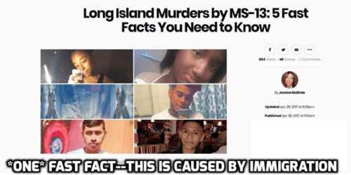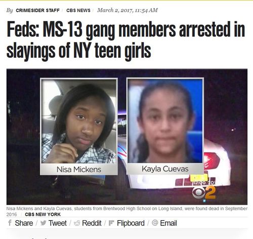 In September, 2016, Nisa Mickens and Kayla Cuevas, aged fifteen and sixteen, were found dead in Brentwood, killed with machetes and baseball bats and mutilated beyond recognition. Thirteen members of MS-13 … were charged in their deaths. Between the beginning of 2016 and May, 2017, authorities in Suffolk County attributed seventeen killings to MS-13, and the county's police department identified at least eighty-nine gang members who were undocumented immigrants.So while a 0.9 homicide rate is pretty nice, without MS-13 hacking teenage girls to death we'd be even safer, perhaps down to German or Italian levels.