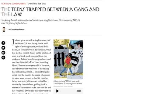 To both points I'd refer you to Jonathan Blitzer's piece in the current issue of The New Yorker. Title: The Teens Trapped Between a Gang and the Law. Subtitle: "On Long Island, unaccompanied minors are caught between the violence of MS-13 and the fear of deportation."
