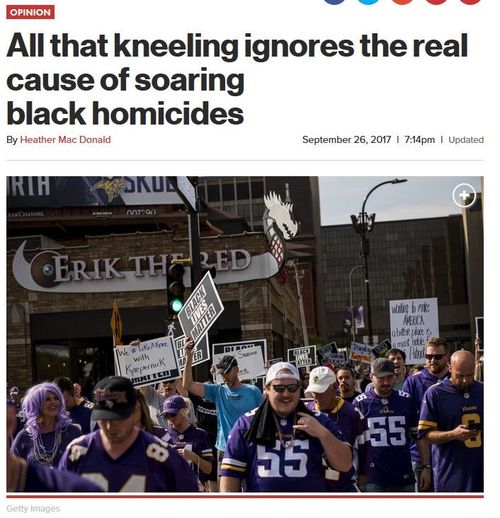 In 2015, a police officer was 18.5 times more likely to be killed by a black male than an unarmed black male was to be killed by a police officer … That 18.5 ratio undoubtedly worsened in 2016, in light of the 53 percent increase in gun murders of officers—committed vastly and disproportionately by black males.They stamp, and pout, and, sputter, and snarl; and white America smiles sadly, shakes its head, and says, "Well, what can you expect, poor things? After all that slavery and discrimination, all that prejudice …"All that kneeling ignores the real cause of soaring black homicides, New York Post, September 26, 2017