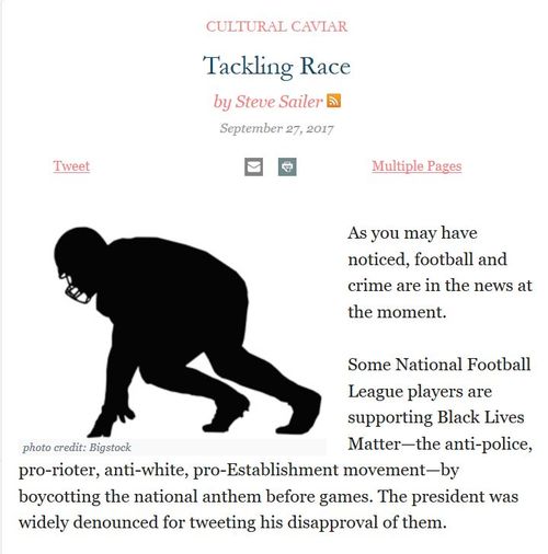 Our own Steve Sailer, who is way more interested in sports than I am—you could hardly be less interested in sports than I am—has superb insights in this area. Here he was writing in Taki's Magazine last week: