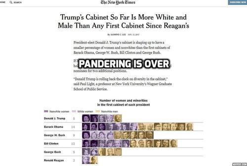 The New York Times recently grumbled that, headline: Trump's Cabinet So Far Is More White and Male Than Any First Cabinet Since Reagan's. [By Jasmine C. Lee, January 13, 2017]