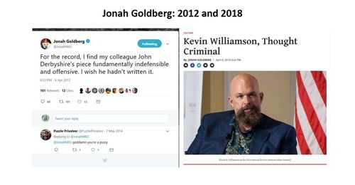 The flagship organ of Conservatism Inc. is suddenly worried about intellectual diversity after The Atlantic fired former National Review contributor Kevin Williamson. David French thinks it is “cowardly” [On the cowardly firing of Kevin Williamson, April 5, 2018]. Jonah Goldberg thinks it is a victory for mob rule. [Kevin Williamson, Thought Criminal, April 6, 2018] Michael Brendan Dougherty denounces “the sudden onset of illiteracy and bad faith of people writing about my former colleague, Kevin Williamson” . [Imagine a genocide, April 6, 2018] The phrase which comes to mind, six years after the purge of John Derbyshire from National Review, is “self-discrediting.” And Conservatism Inc. has put itself in this position by triangulating and “purging” itself into irrelevance.