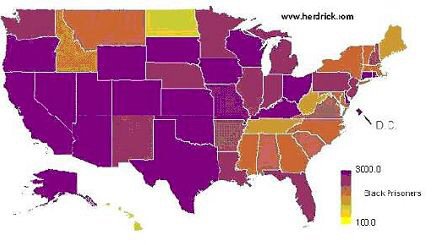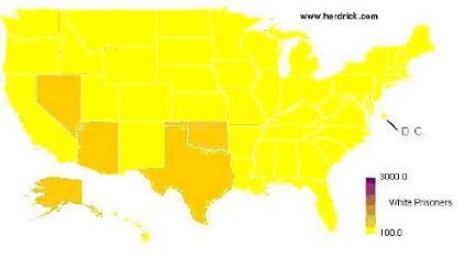 As you can see, in all states, white imprisonment rates are relatively low, so the whole map comes out in shades of yellow. The largest percentages of whites are imprisoned in old Wild West states: Alaska, Oklahoma, Nevada, Arizona, and Texas. Whites are least likely to be locked up in the District of Columbia, Minnesota, New Jersey (much to the surprise of Sopranos fans), North Dakota, and New York.