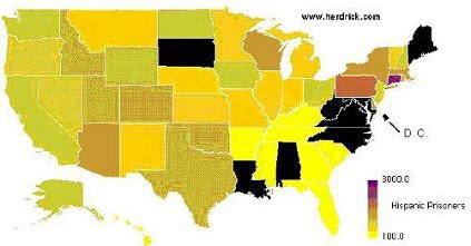 Here's the Hispanic imprisonment rate map. Unfortunately, the data were either completely missing or obviously inadequate for ten states, which show up in black.