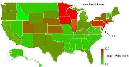 In contrast, by far the greatest racial disparity was found in the most liberal spot on the map: the black-run District of Columbia, where Bush won only nine percent of the vote. Blacks in Washington D.C. are 56 times more likely than whites to wind up in the slammer.