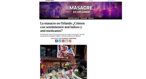 A June 13 article by Excelsior correspondent in London (!) Julio Alejandro, is headlined La masacre en Orlando ¿Crimen con sentimientos anti latinos y anti mexicanos? (“The Massacre in Orlando—A Crime with Anti-Latino and Anti-Mexican Feelings?”):