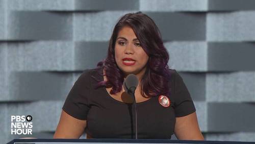 Right off the bat, Astrid Silva identifies herself as a “DREAMer” whose family came here when she was four, “looking for a better life”. She sets herself up as “representing the Democrats, the Latinos and the 11 million undocumented immigrants who are an integral part of this country and who constitute the values and the promise of the United States, and whom Trump is threatening with his mass deportation plan.”