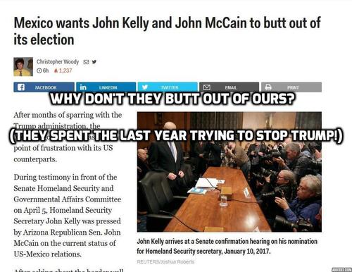 ….to stop pursuing the migrants, that they respect human rights and that they do not attempt to resolve problems with the use of force, and don’t stick their noses into [the Mexican election of] 2018.Several days later, at a rally in Mexico City, AMLO repeated the warning, demanding “the United States not meddle in affairs that only concern Mexicans” such as their election.'EU debe aprender a respetar y a no meter las narices': AMLO [“The U.S. should learn to respect and not to meddle: AMLO] by Isabel Gonzalez, Excelsior, April 7th, 2017