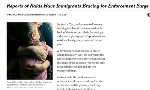 Yet for some reason, the Main Stream Media is running sob stories portraying it as somehow wrong that illegal immigrants fear consequences for their crimes [Federal immigration raids net many without criminal records, sowing fear, by Arelis R. Hernandez, Wesley Lowery, and Abigail Hauslohner, Washington Post, February 16, 2017]. Thus, we get lurid tales of illegals being detained after leaving a church homeless shelter, locking themselves in their homes or not going to work or school.