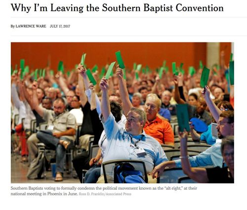 An incident last month has compelled me not only to leave, but also to explain why. During the Southern Baptist Convention’s annual meeting, Dwight McKissic, a prominent black pastor in Arlington, Tex., introduced a resolution that denounced white supremacy and the “retrograde ideologies, xenophobic biases and racial bigotries of the so-called alt-right.” The resolution should have been immediately adopted. It was not.So the Southern Baptist Convention adopted the resolution, but Ware objects that they didn’t adopt it immediately! And, some didn’t take it seriously. And I guess all that “parliamentary procedure” slows things down. But it finally was adopted overwhelmingly. In fact, Ware’s own op-ed contains a photo of almost entirely white SBC messengers (delegates) holding up green cards to denounce the Alt Right. Isn’t that a victory?A contingent of predominantly white, old-guard members refused to take the resolution seriously, even while many black and progressive clergy members advocated its adoption. It was not until chaos ensued that a reworded resolution vowing to “decry every form of racism, including alt-right white supremacy, as antithetical to the Gospel of Jesus Christ” was adopted. [Links in original]