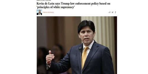 De León is also a rabid Hispanic nationalist (which is apparently OK, unlike white nationalism). He was the author of the recent bill, signed into law by Governor Brown, to make California a sanctuary state. He openly boasted that this was designed to thwart what he called Trump’s “perverse and inhumane deportation machine” (a.k.a. enforcing U.S. law) and grandly declared that the state is “building a wall of justice against President Trump’s xenophobic, racist and ignorant immigration policies.” He also declared President Trump’s law enforcement policies are built on “white supremacy” and “constant and systematic targeting of diverse cities and states” [Kevin de León says Trump law enforcement policy based on 'principles of white supremacy,' by Patrick McGreevy, Los Angeles Times, April 21, 2017].