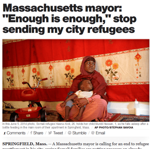 In 2014, New England mayors from both parties pleaded with the Obama administration to enact a refugee resettlement freeze as the flood of unassimilated newcomers strained their schools and municipal resources. "I have enough urban issues to deal with. Enough is enough," Springfield, Massachusetts mayor Domenic Sarno, a Democrat, declared at the time. "You can't keep concentrating poverty on top of poverty."