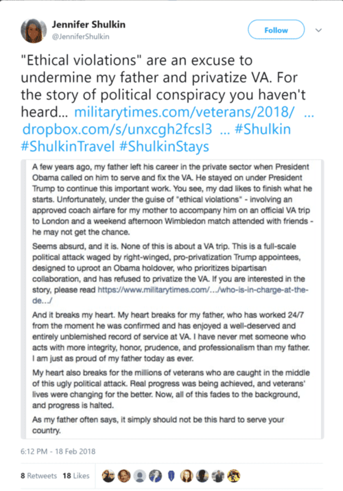 Trump's VA secretary, David Shulkin, is an Obama holdover. His main agenda is to block any real reforms for veterans, which includes expanding their ability to obtain care from private doctors and hospitals. His daughter, Jennifer, is a Harvard law student and loudmouth Huffington Post contributor who used her Twitter account recently to defend her dad against "right-winged, pro-privatization Trump appointees."